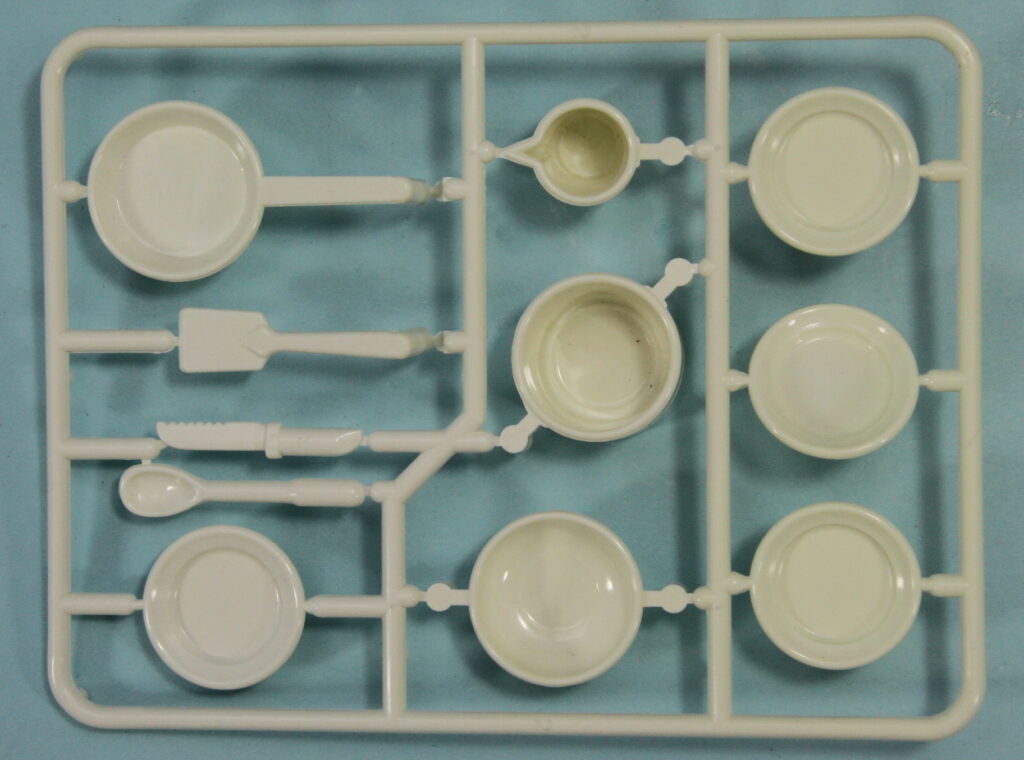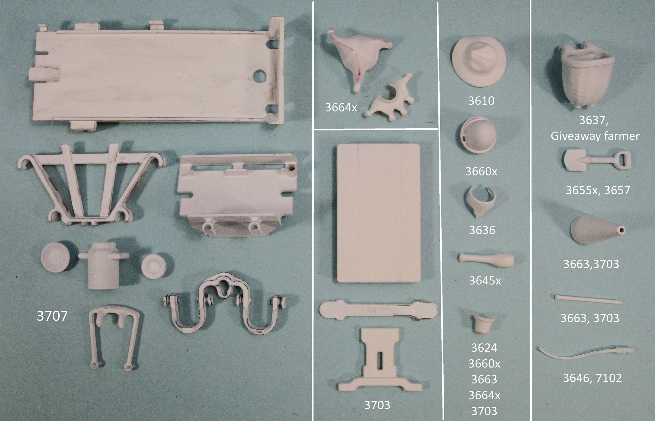 The presence of sprues is useful, allowing the assumption that all parts found on the sprue will be present in the set, even if they are not all visible on the box picture. An example of this is in set 3660x where a frying pan shown on the box picture makes it safe to assume a further 10 cooking implements and utensils were also present.