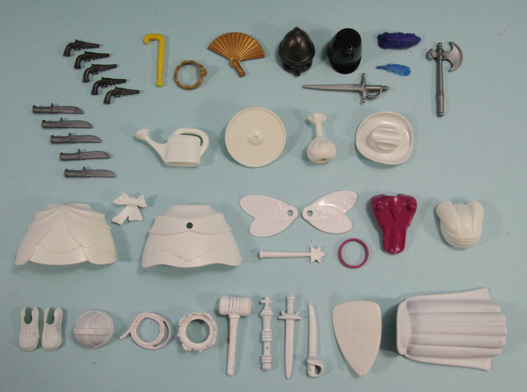 The white parts on the bottom row are from the PlayBIG toy range, with nothing similar in Playmobil, apart from the hammer, which is smaller than the Playmobil equivalent